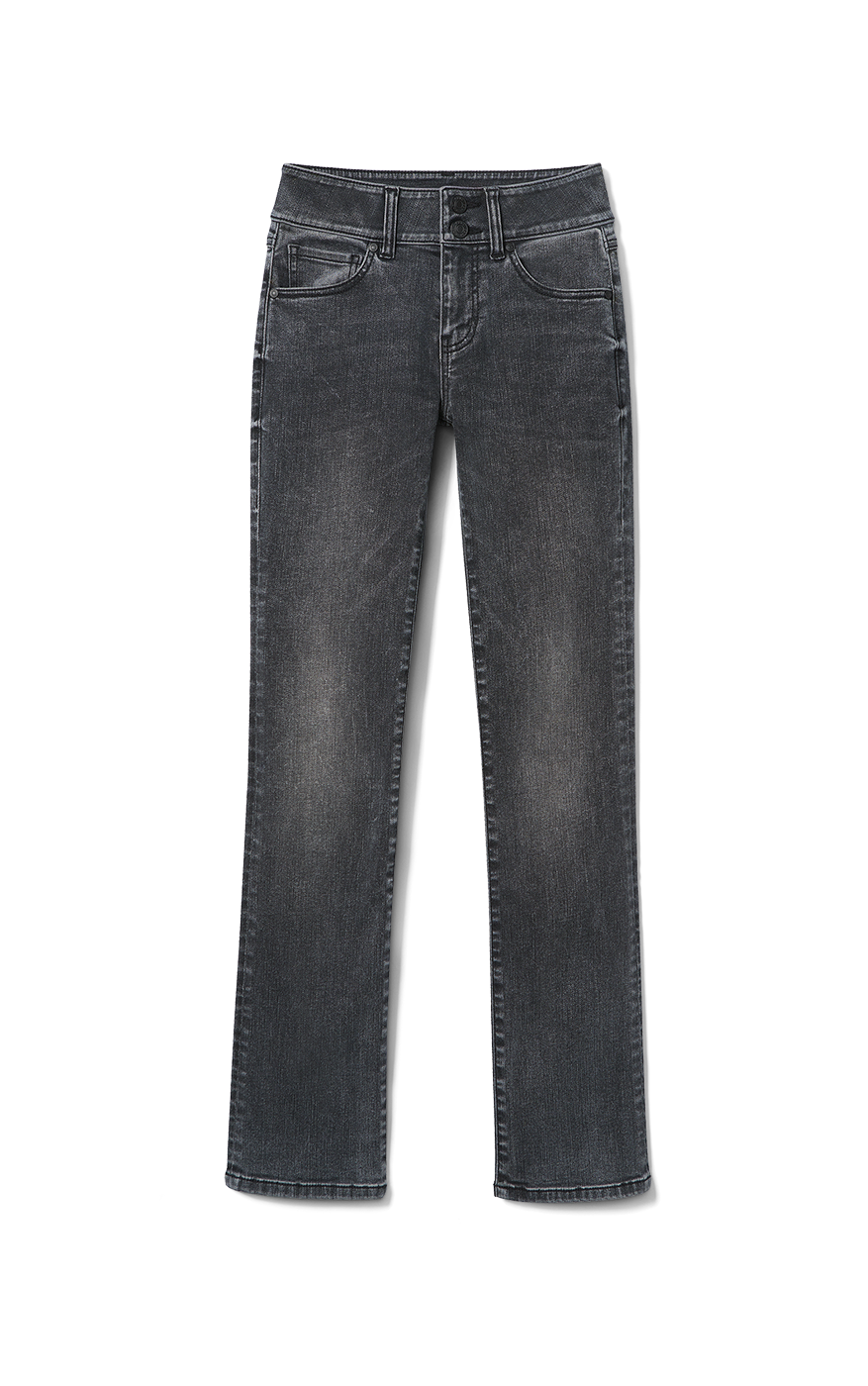 - Slim fit, high rise, two button zip fly, five-pocket styling, straight leg Superstretch woven fabric