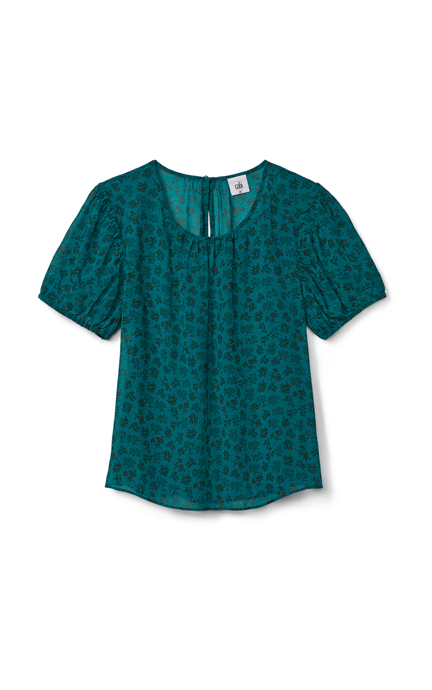 Get a new view of you in the Panorama Top. Crafted in poly chiffon with a crew neckline, shirring, and a keyhole closure, it looks lovely from every angle. The short sleeves with elastic at the hem and shoulder provide a flexible fit, while the subtle floral takes your print-mixing game to new heights. Pair it perfectly with the Kick It Skirt.