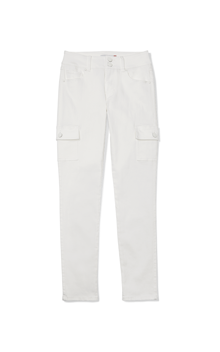 In striking white, the Skinny Cargo features a mid-rise with cargo pockets on the thighs, matte white jean tacks, and a double-button closure on the wide waistband that cinches you in all the right places. This cargo is precious.