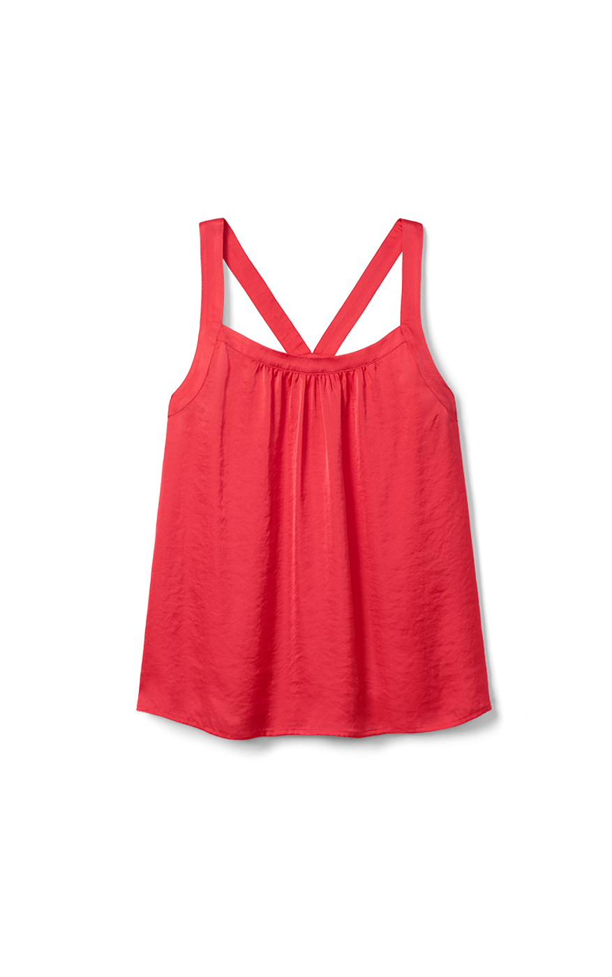 Add a pop of whimsy with the vibrant Whim Top. This playful poly top features an easy fit, scoop neckline with delicate shirring, and structured banded details. The unique “V” straps in the back add a modern twist.
